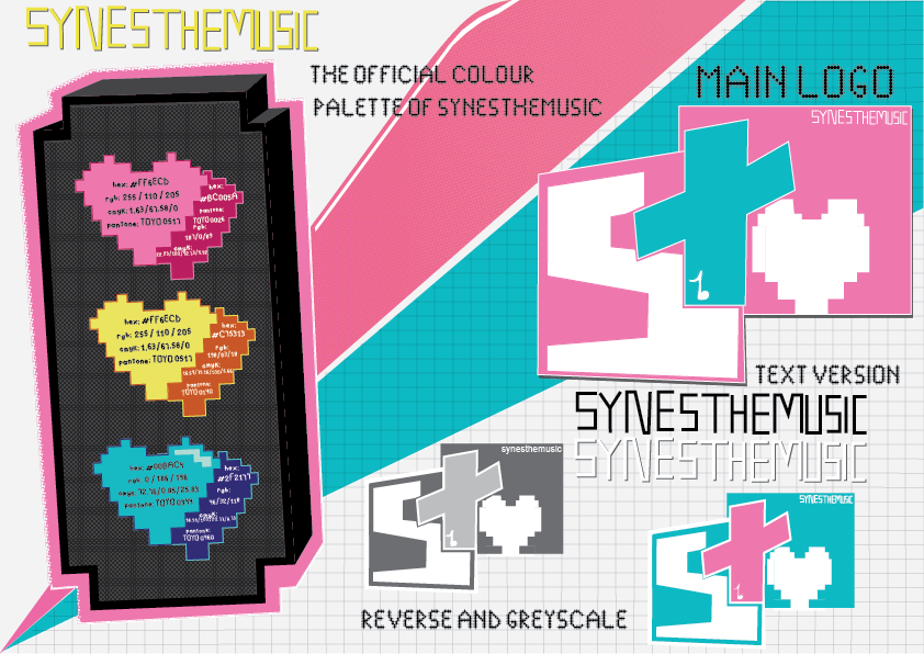 The first typographical page includes some necessary information such as the main colour combination, and the logo which represents Synesthemusic. The three colours that I decided were suitable for my brand are bright pink, yellow and blue due to the versatility of these colours, and due to the fact that they are harmonious with each other. I have included different variations of the logo so that any outsider design company can reference back to it and use it in a way that is fitting to the brand.