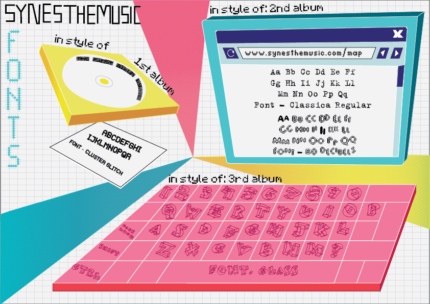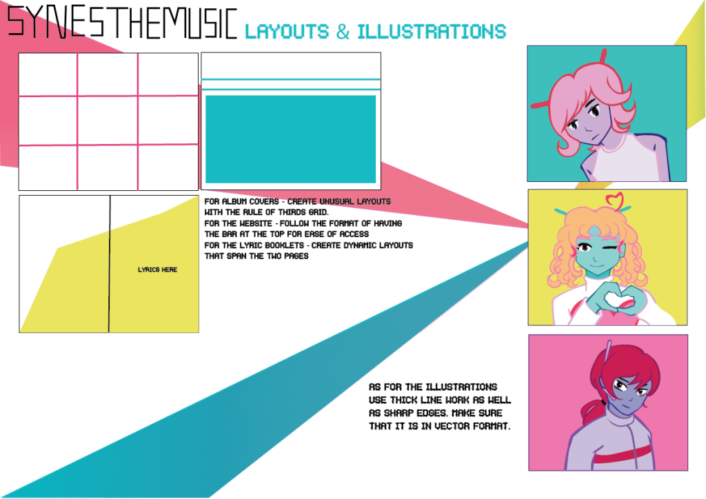 The final typographical page presents the layout and illustration style which is the main part of what makes Synesthemusic stand out. Firstly, the layout is rather simple and conventional in order to make it easier for the designs to stay consistent with each other. The difference in these layouts is that I have decided that they should use those simple layouts in more creative ways, such as treating the 3×3 squares as pixels, with some of them presenting different images as a reference to machines glitching, therefore linking back to the signature style of Synesthemusic. The illustrations of the characters are meant to aid the audience in visualizng who the albums are about and to help designers with what colours schemes to keep and how the character is designed.
