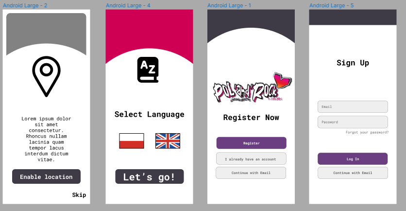 A unique feature which many mobile applications have is the onboarding feature which can determine whether the user will go through with using your product or abandoning it completely depending on how well it is executed. For example, including a lengthy form at the onboarding stage and making it a requirement to complete it in order to access the rest of the app at all. When it comes to the Pol’and’Rock festival app I am creating, I tried to ensure that the onboarding stage takes a few seconds but is flexible enough so that their experience of the app is customizable (e.g. language selection or location). I have also included an option to create an account on the app due to it being a popular demand in the survey, as well as offering the option to save their favourites and upload pictures of the festival from their account. However, this feature does not lock anyone out from being able to access the app, it just limits the forementioned features – this has been done to ensure that the app can be accessible to everyone and to increase the amount of time that the user stays on the app. According to Kurzweg (2023), mobile app onboarding is significant because it puts the product’s value in front and center.