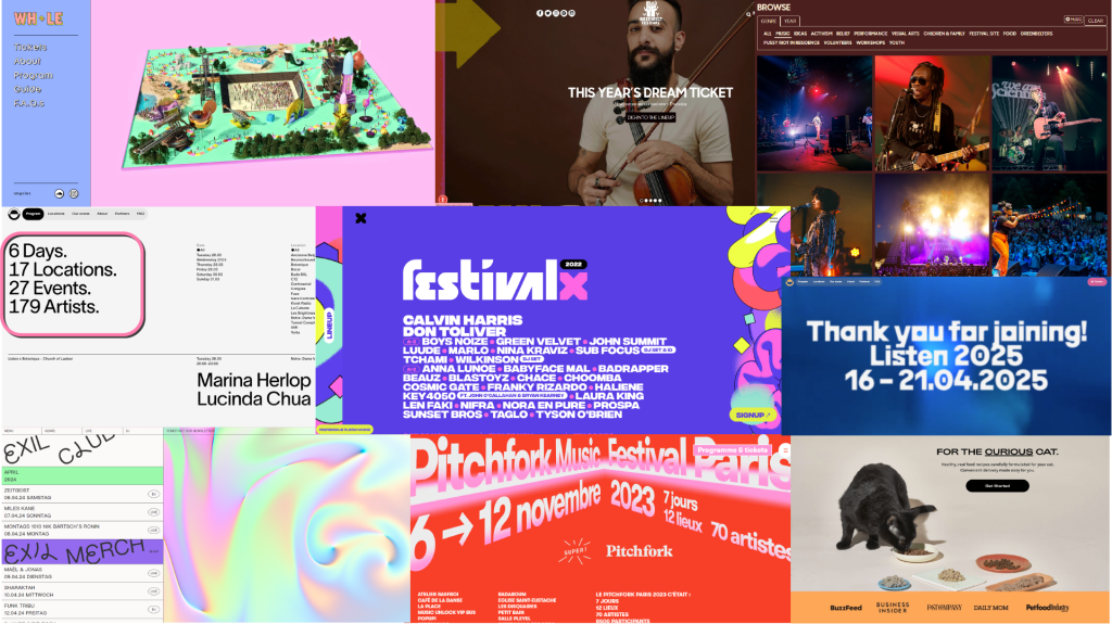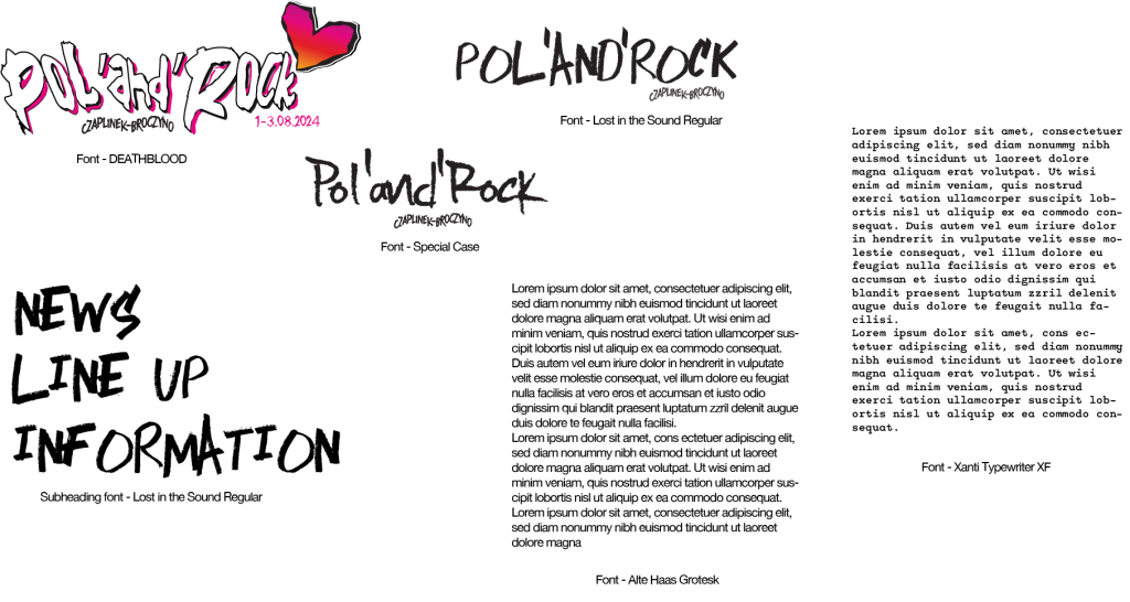 In terms of typography, I have carefully searched through mutiple sources that offer fonts and found a few which fit the purpose and branding of this festival. For the main title logo, I have used the Deathblood font and customized it in order to create a slightly chaotic and artistic atmosphere which is associated with the Pol’and’Rock festival. The subheadings present on each subsection of the site are written with the Lost in the Sound font, and it presents a marker-like texture as well as being a script font which harmonised well with the font used in the heading. I have made sure to prioritize the aspect of the text being readable without losing its stylistic qualities that encompass the creative vision behind the festival. As for the body text, I have decided to select a simple and sleek font with a typewriter feeling to it – when creating a website or app, it is incredibly important to keep legibility and ease of readability at the front of your consciousness since if it is neglected, the product will end up unusable and it will go against the customer needs.