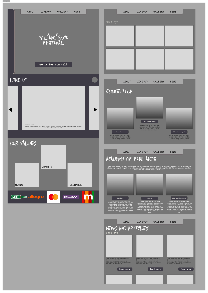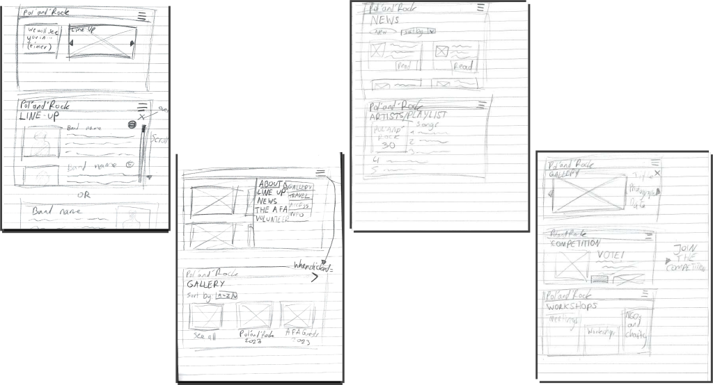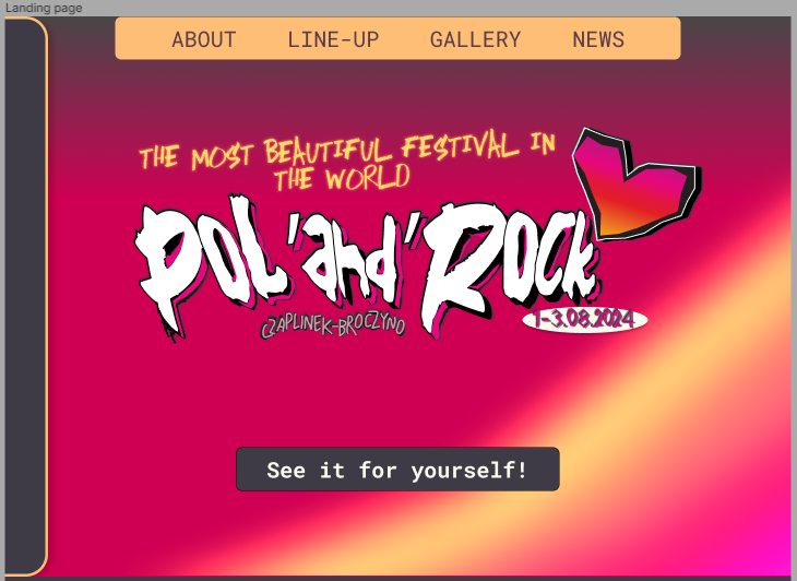 The landing page of the website presents the logo with bold lettering as the focal point of the page and I have included a gradient, rainbow overlay over the original colour palette to increase contrast and harmony as well as paying homage to the rainbows present in the original version of the Pol’and’Rock website. The conventional landing page usually includes a call-to-action button utilizing creative wording to invite new users to click on it and visit the full website, driving engagement up and increasing profits for some of the stakeholders.