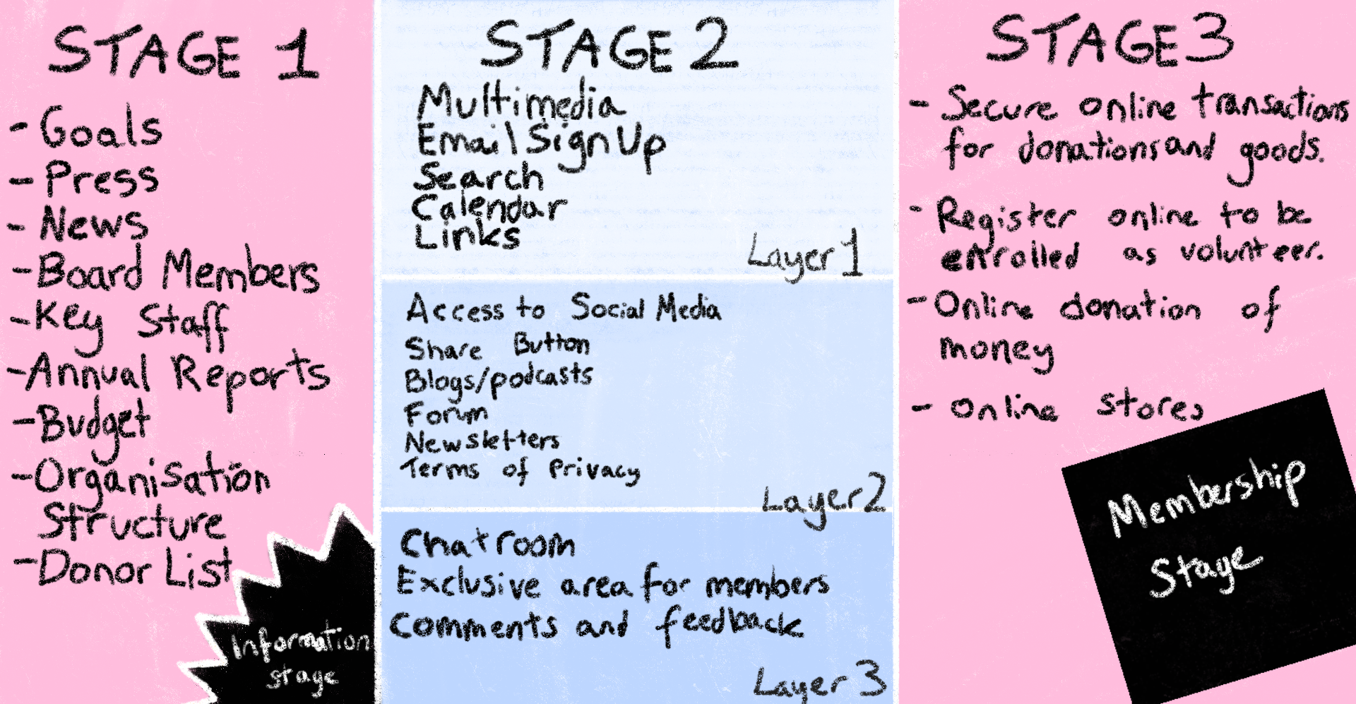 I have created a diagram of the EMEA stages of user engagement inspired by the journal written by Carrillo-Durán, M.V., Tato-Jiménez, J.L., Chapleo, C. and Sepulcri, L. (2023). This information presents how creativity and innovation shaped how NPOs present themselves digitally because it presents the different layers of interactivity that a person would have with an NPO, and which web features correlate to them.