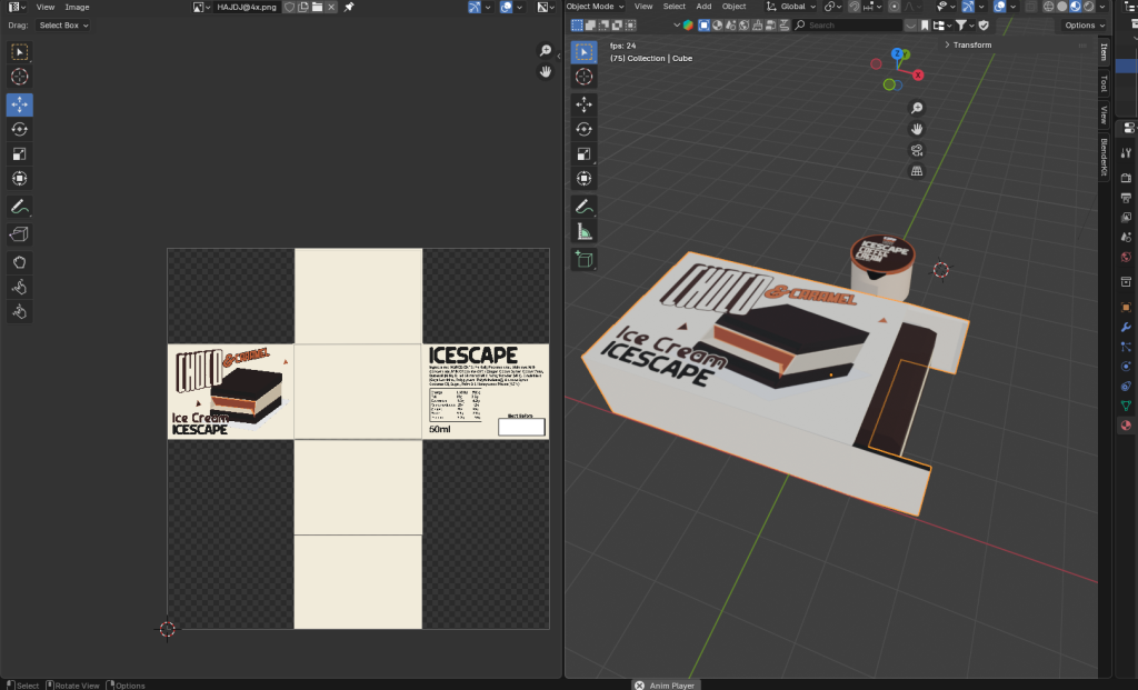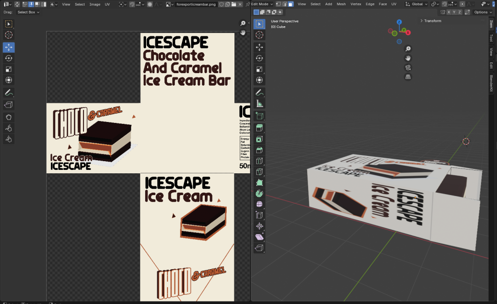When attempting to UV unwrap and image texture this box, I have made the amateur mistake of not properly setting the seams and instead using the default box “cross” shape to apply the design to. The image above has proved that this in fact did not work out. My solution to this has been to start from scratch and try to UV unwrap it correctly this time.